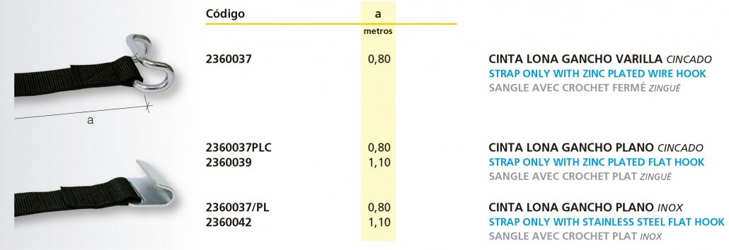 Cinta con gancho para los laterales de los toldos de camión. Tenemos de distinta longitud, según necesidad del cliente y también con distinto tipo de gancho, gancho plano inoxidable o bien de acero cincado o con gancho varilla.