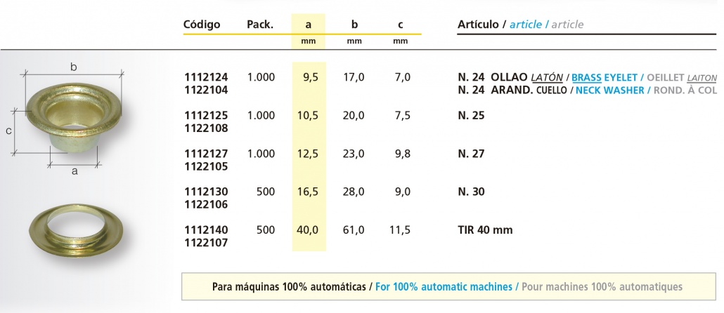 Ollaos y arandelas con cuello imprescindibles para poder trabajar en máquinas 100% automáticas. Las arandelas de cuello son necesarias para poderse guiar en este tipo de máquinas que colocan automáticamente los ollaos y las arandelas en el tejido. Tenemos arandelas de cuello de distinto tamaño, de 9mm, de 10,5mm, de 13mm, de 16mm y de 40mm.