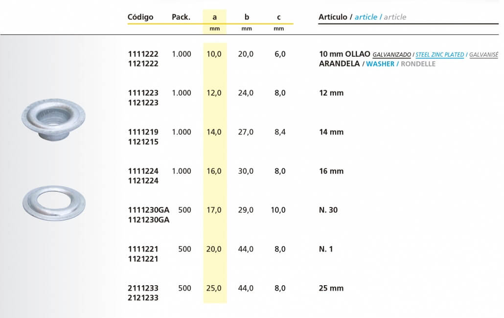 Se fabrican con fleje de acero galvanizado de 0,5mm de espesor el ollao y de 0,4mm de espesor la arandela.