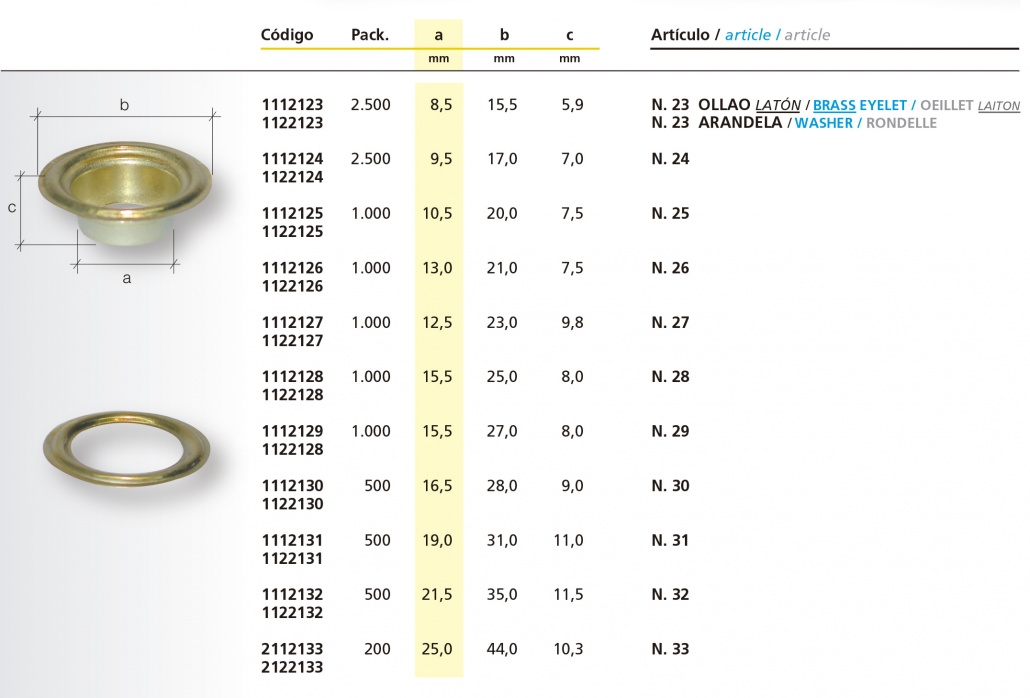 Fabricamos muchas medidas distintas, normalmente lo que manda a la hora de escoger un ollao de latón es el diámetro interior del ollao, es decir, el agujero que queremos que nos quede una vez hemos colocado el ollao.