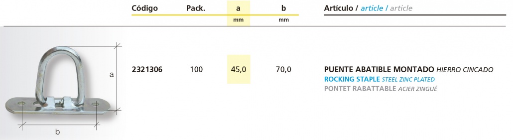El puente abatible montado tiene la anilla fijada a la pletina, y el movimiento de la anilla es perpendicular a la pletina. se fabrica en hierro cincado.