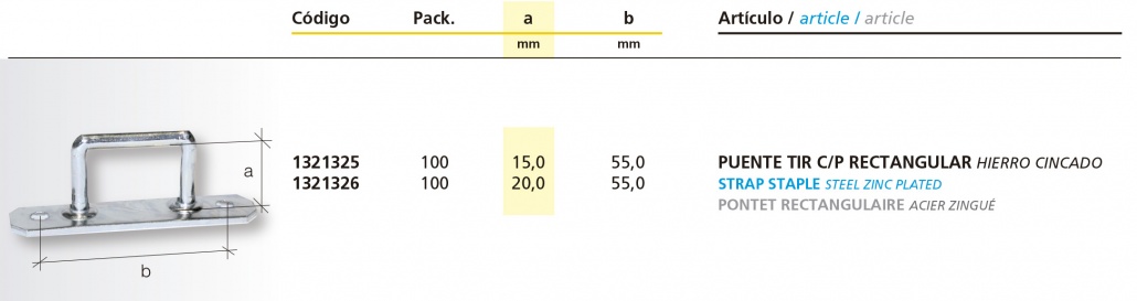 Tenemos 2 modelos de puente rectangular, uno que hace 15mm de altura y otro de 20mm. Se fabrican los puentes de hierro y posteriormente se llevan a cincar para protegerlos frente a la oxidación. Se colocan con remaches sobre alguna estructura, o también sobre la lona.