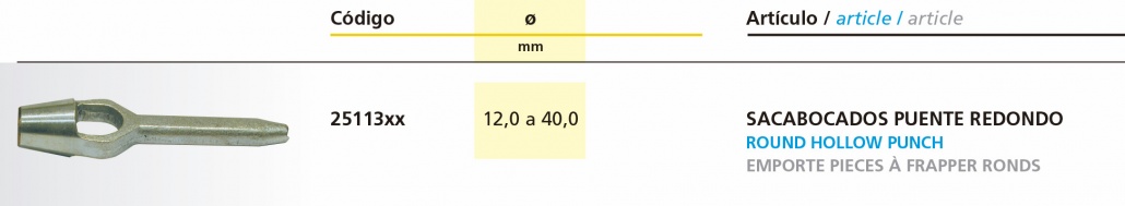 Sacabocados puente redondo es una herramienta manual utilizada para hacer agujeros circulares en materiales como papel, cartón, cuero, tela y otros materiales similares. Está diseñado con un mango de forma cómoda y una cabeza circular que se puede ajustar para seleccionar el tamaño del agujero deseado. Estos sacabocados deben utilizarse con mazos o martillos de nylon así como con planchas de polietileno para alargar al máximo su vida útil. Consulta nuestra sección de herramientas.