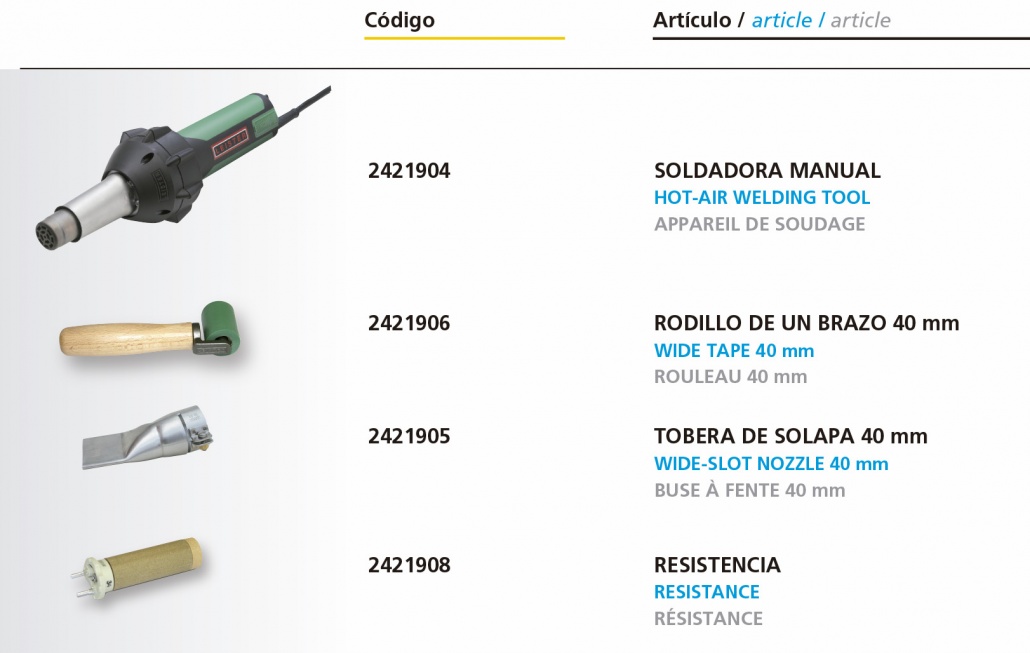 Esta soldadora manual de la marca suiza Leister se utiliza para soldar materiales termoplásticos como láminas de PVC, lonas de vinilo y membranas impermeabilizantes. Funde el material termoplástico y lo une. La velocidad del flujo de aire caliente, la temperatura y la presión se pueden ajustar para adaptarse al material que se está soldando. Es fácil de manejar y adecuada para soldar grandes superficies o áreas difíciles de alcanzar. Consulta nuestra sección de herramientas.
