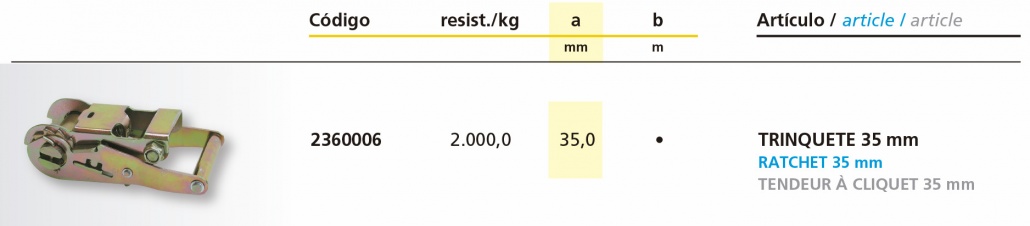 Trinquete o también denominada carraca, sirve para confeccionar conjuntos con cinta de 35mm, la resistencia es de 3000 Kgs.